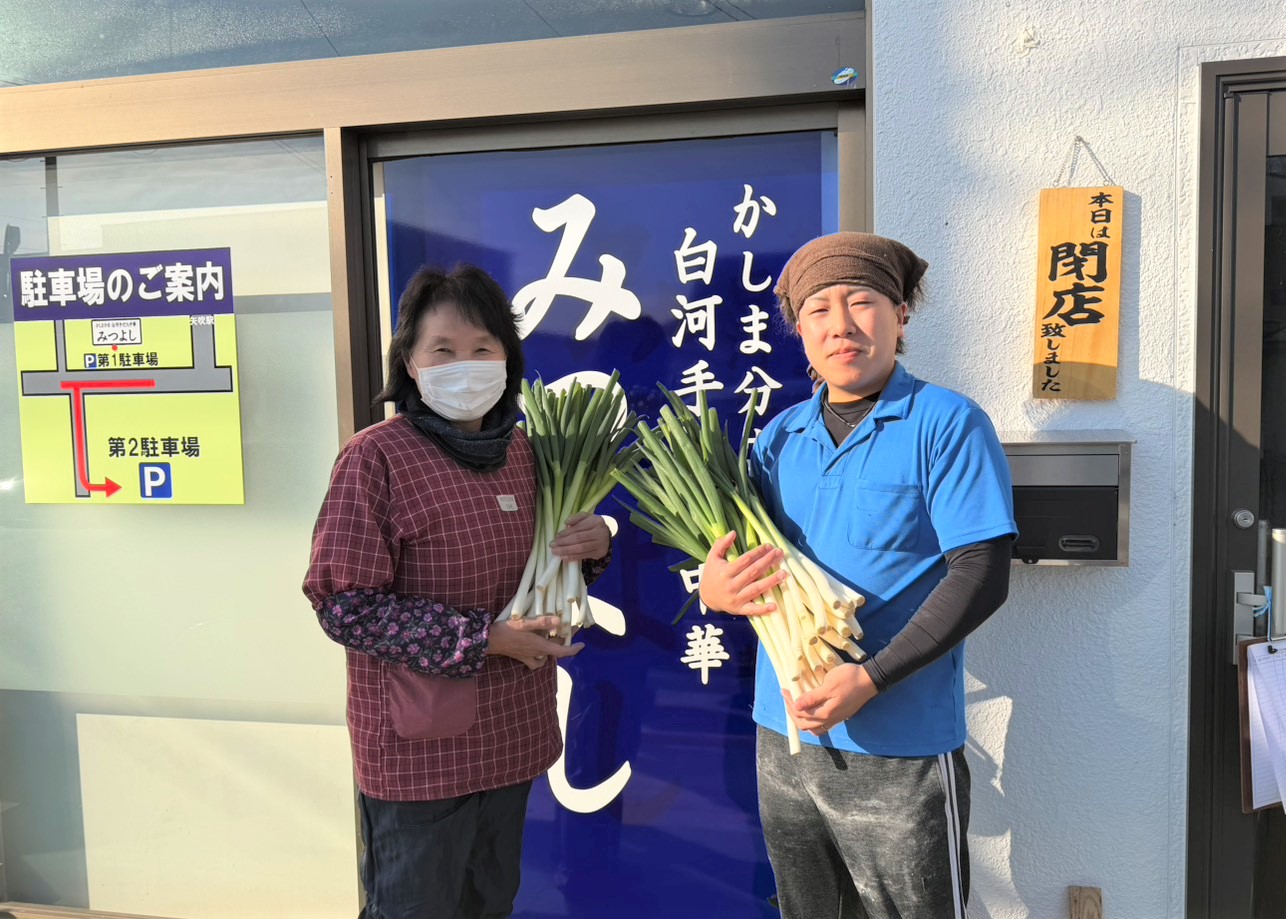 地場産食材の活用も目標にしており、ラーメンの定番具材であるホウレン草を矢吹町内の農家さんと契約できたことを皮切りに、長ねぎ、お米についても須賀川市や白河市など近隣の農家さんとの契約ができました。町内の畑で栽培された長ねぎをふんだんに使用した「ねぎ餃子」が、今では人気メニューの一つになったことも嬉しいですね。