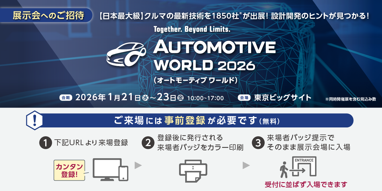 (公財)福島県産業振興センターでは、「オートモーティブワールド2026(第12回 自動車部品&加工 EXPO)」に福島県ブースを設置し、県内企業7社で共同出展いたします。 自動車関連の製品・技術・取り組み等をご覧いただきたく、皆様のご来場をお待ちしております。 ◆名称:「オートモーティブワールド2026(第12回 自動車部品&加工 EXPO)」 ◆会期:令和8年1月21日(水)~23日(金) 10:00~17:00 ◆会場:東京ビッグサイト (東京都江東区有明3-11-1) ◆福島県ブース:W13-44(西棟4階) ◆出展企業(ブース番号順):①木村可鍛㈱、②㈱ニッセイ、③㈱moegi、④ツオイスダイカスト㈱、⑤アサヒ電子㈱、⑥ムネカタ㈱、⑦㈱会津工場 ◆ご来場登録はこちら <https://www.nepconjapan.jp/tokyo/ja-jp/register.html?code=1548424837071126-G0U> ※本展示会は事前登録制のため、ご来場には必ずご登録が必要です。 (公財)福島県産業振興センター 取引支援課 担当 佐藤 E-mail:sato-yukiko@f-open.or.jp